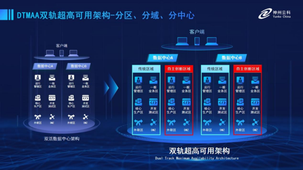 为帮助金融客户更好地应对数字经济时代对可持续性的高要求,实现“信创”与“数字化”齐头并进,fun88乐天使推出了双轨超高可用架构。该架构在双活数据中心的分区调度基础上,增加信创域和非信创域的分域调度,实行信创域与传统域应用全量部署,使双中心运营变为双中心四区域并行运行,互为多活,将“0到1”的单轨建设道路变为分区分域协同的多活双轨超高可用架构。帮助客户在新架构下,保障“信创”的同时解决性能瓶颈,提升稳定性,保证应用可持续性,最终实现信创区域和非信创区域的平滑过渡,完成国产化替代目标。